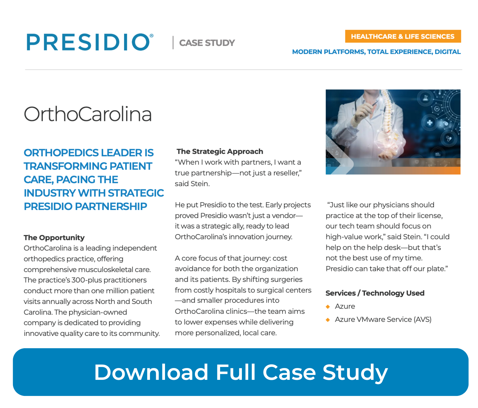 This cloud-based healthcare IT platform increased agility, scalability, and cost control, allowing OrthoCarolina’s technology team to focus on innovation and strategic projects. As Stein describes, “Just like our physicians should practice at the top of their license, our tech team should focus on high-value work. I could help on the help desk—but that’s not the best use of my time. Presidio can take that off our plate.”