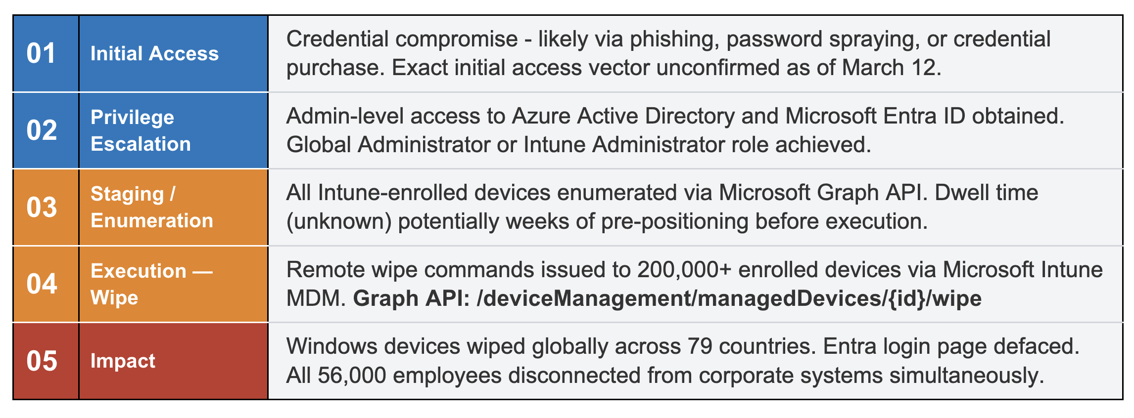 This attack is a masterclass in living-off-the-land tradecraft applied at destructive scale. Each step in the chain used legitimate Microsoft infrastructure: no custom implants, no exploit frameworks.
