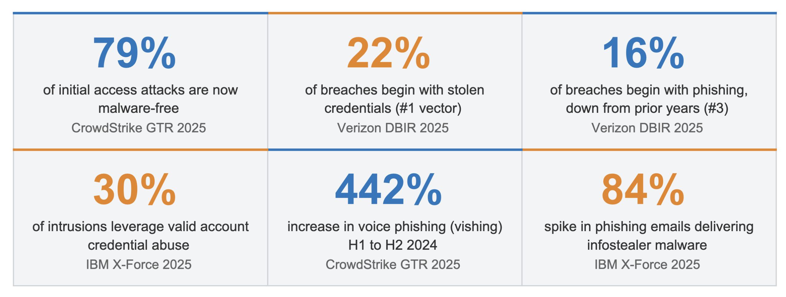 This MDM attack did not happen in a vacuum. The industry’s three major 2025 threat reports all independently confirmed the same structural shift that enabled it: attackers have largely abandoned malware delivery in favor of credential theft and identity abuse.