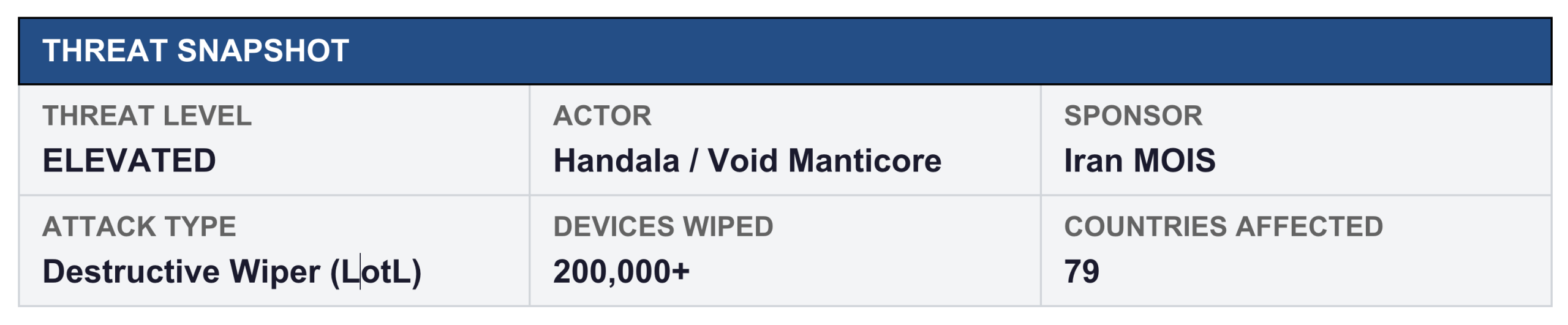 Void Manticore’s defining characteristic is an ‘opportunistic and quick-and-dirty’ operational tempo focused on maximum visible damage. Their 2026 campaign has included: