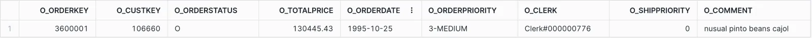 SELECT * FROM demo_db.demo_schema.orders WHERE O_CUSTKEY = 106660
