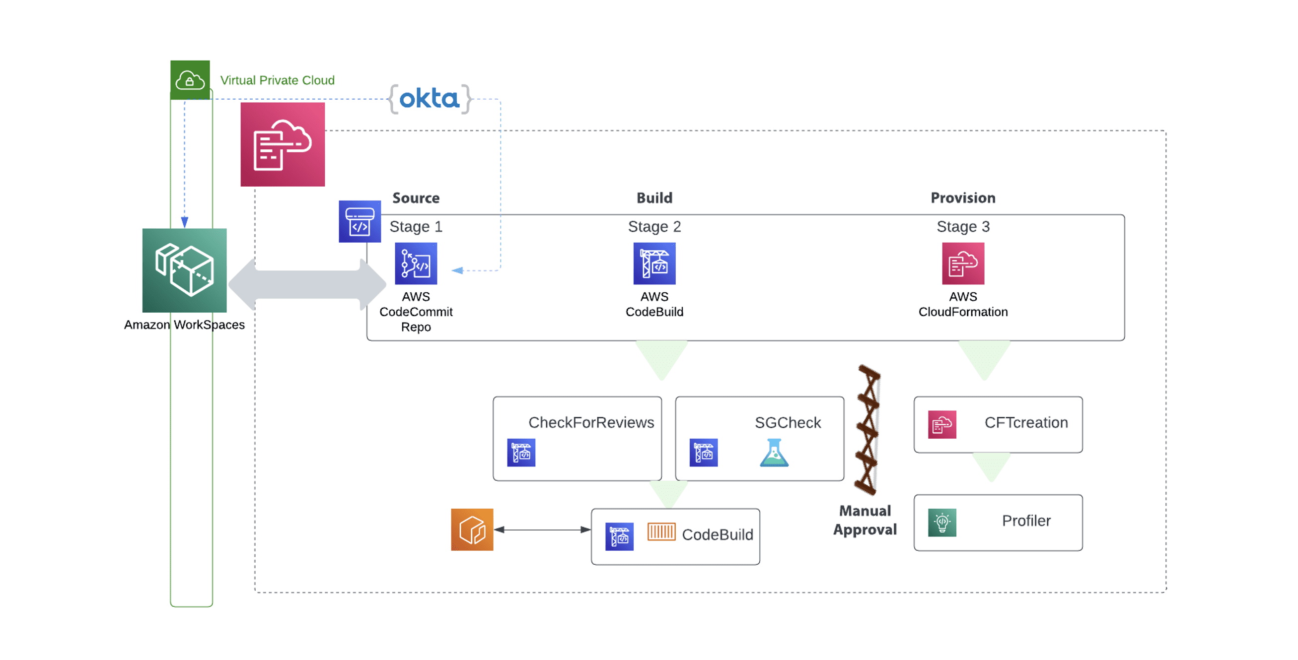 The solution is presented in a ‘good’, ‘better’, and ‘best’ option set, allowing you to select the options that best fit your need. The good foundational solution starts with a CI/CD pipeline that allows your team to start and have a set of security tests right out of the box. The better implementation adds Amazon Workspaces to allow for a development work environment that is controlled and protected. As the best option, a managed Identity provider, like Okta, is added to the environment so that access control can be easily maintained from the corporate environment.