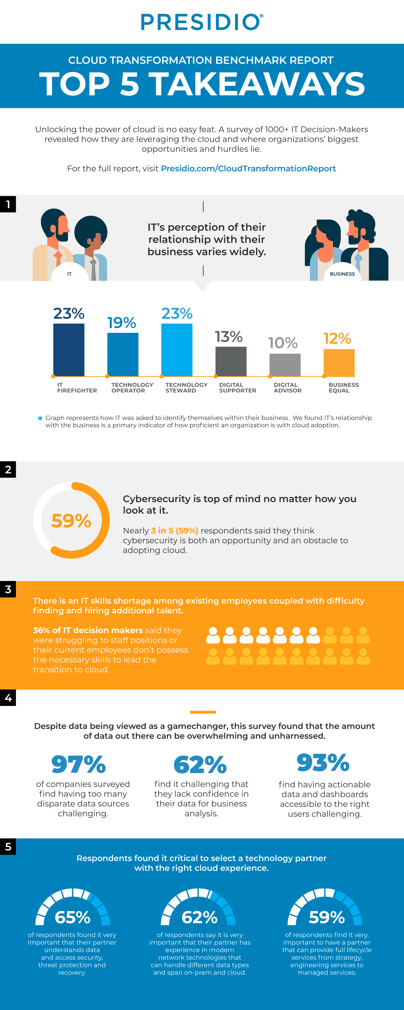 Last year, we released the 2022 Cloud Transformation Benchmark report. The report consists of our findings from a survey of over 1,000 IT decision makers. Of these findings, 5 major themes stood out. Here our our 5 main takeaways from the report.